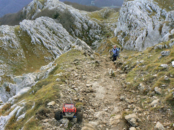 Hoy estaba especialmente concurrida la cima, también hacia el Aketegui, cercana cima unos metros mas alta se veía gente subiendo. Había gastado ya 6 dobles packs de baterías para subir, cuando debería haber utilizado 5 como mucho. No solo no iba a tener autonomía para seguir por la rocas hasta el Aketegui sino que las dos restantes iban a fallar y no tendrían suficiente para bajar. El resultado fue que tuve que acarrear el Emaxx durante un Km. y medio de sendero, a la bajada. El Emaxx es un coche pesado, cuesta llevar todo el rato en una mano 6 kilos, además es grande, se balancea y desquilibra. Yo le llevo colgado en bandolera de un cinturón de judo, a la altura justa de la cadera y en donde puedo sujetarlo un poco con la mano, Aquí en estas piedras terminaría con buena parte de la bebida, frutos secos y chocolatinas cereales que suelo llevar.