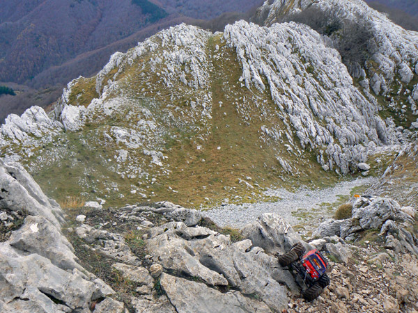 Pequeño sendero Me gusta esta zona de hierba y pequeña vaguada, en invierno muy a menudo con nieve o agua, Corresponde también a una parte de la foto anterior que quedaba oculta por unas rocas. Puede atravesarse bajando un poco y luego subiendo o bien bordearla sin perder altura por las piedras que vemos a la izquierda. Tal y como iba de baterías, preferí bajar este cacho.