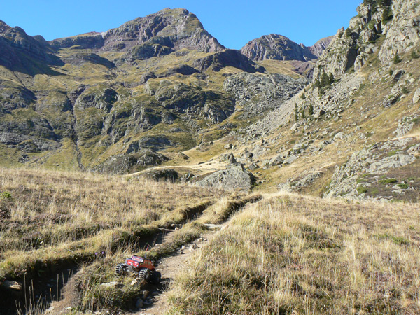 Venimos siguiendo desde el parking de Anayet en la estación de esquí las inconfundibles marcas de GR que en esta parte de su trazado nos llevaría de Formigal a Canfranc por el collado de Anayet, la Rinconada y Canal Roya. Hay un cacho de unos 100 metros de este camino que cruza de nuevo del margen derecho al izquierdo del Culivillas y que difícilmente podremos superar con el Emaxx a menos que nos tiremos media mañana buscando pasos de trial accesibles. No me corto, coche a mano y para arriba ya hemos perdido demasiado tiempo desayunando en Biescas . Poca paciencia. Luego de repente la pendiente aumenta pero es fácil, tiene piedra pequeña y no desliza demasiado. Poco a poco vamos ganando altura, aunque el altímetro parece clavado en 2000 metros y parece no querer girar más. Mi hijo no hace más que preguntar cuanto desnivel falta. Cada veinte metros claro, para eso es un niño. Y como no le puedo decir que hace rato que faltan 200, le voy contando 199, 198 ...