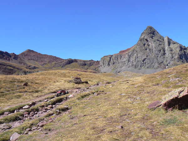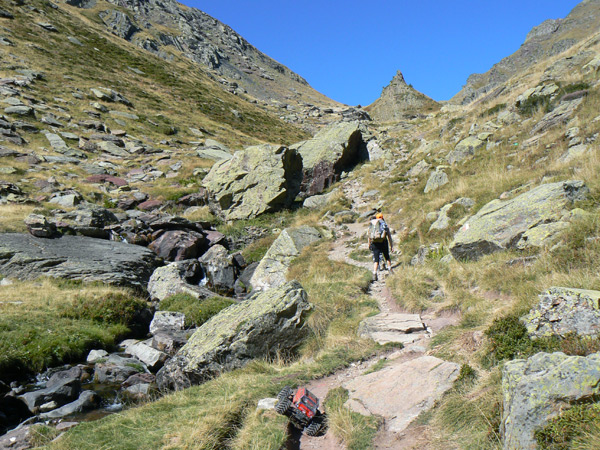 Después de la caída no dude en sacar el atachuchos de recogida automática para asegurar el coche a mi cinturón , da 6 metros de cinta .Suficiente para frenarlo a tiempo si decide largarse por sitios poco apropiados. Lo ideal sería que detectara cuando hay tirones , como en los cinturones seguridad del coche 1/1 y bloqueara la cuerda . De esa forma podría llevarse el mando totalmente desatendido y seguro manteniendo las dos manos en la emisora para controlar acelerador-freno , dirección y cambio de velocidad. Ya con algo más de seguridad parece menos problemático acercarse hasta esa marca en forma de flecha roja que he insertado en la esquina superior de la foto, es que tenemos que ir hacia allí , por donde otro excursionista avanza y no me apetece otra bajada por esta ladera en busca de baterías. El sendero zigzaguea para ganar altura y de repente se adivina el collado final, origen del rio Culibillas, que da acceso a las praderas de Anayet.