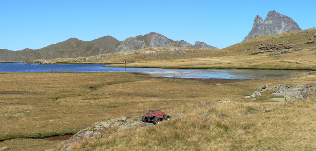 Vuelta al Ibon Durante toda la vuelta no tienes tiempo ni ganas de fijarte mucho por donde anda el Emaxx es tan grande y llano que prácticamente puedes andar a 1/4 de velocidad sin mirar por donde va. El paisaje mires por donde mires es impresionante. Así despistando me fui acercando a una de las muchas escorrentías que se acercan al lago y al estar ya metido medio coche dentro decidí continuarla. No eran más de 4 metros pero la salida fue un poco dificultosa. A pesar de haber cambiado recientemente otro pack de baterías no le fue fácil salir de aquí, acelerador a fondo para apenas girar las ruedas, sin ambos diferenciales bloqueados dudo que hubiera podido salir por sus medios. De hecho si la trasera izquierda hubiera llegado a hundirse tanto como la derecha los bajos habrían quedado encima del barro complicando la cosa. Venga, otra panorámica hacia el Este que quiero recordar durante mucho tiempo.