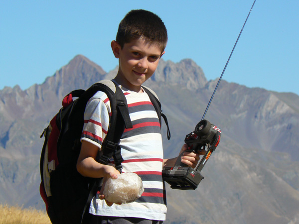 El chaval encuentra una piedra preciosa , creo que es Sal y mientras lleva el coche por los prados con esa cara de pillo parece querer endosarme la piedra a la mochila. Da igual que esta pese 14 Kg y casi la mitad sean de baterias y algunos recambios. Se trata de una piedra preciosa. Al final es mamá la que ayuda.