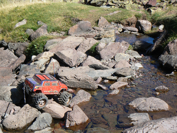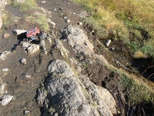 Tras superar una pendiente suave y andar unos 300 metros por encima de la salida cruzamos el río y tras un paso estrecho entre piedra por la que apenas cabe el Emaxx empezamos a encontrar más piedra que por su color y forma me recuerda un poco al barranco de Remuñe, cerca de Benasque. Nosotros vamos a seguir ahora por la orilla izquierda hasta esa elevación que se ve al fondo de la imagen. Ya vamos con el tercer doble pack de baterías y las Duratrax 4200Mah siguen siendo poco dosificables , muy bruscas. No puedo acercarme a menos de 2 metros del coche ya que un problema con el receptor no original, hace que se dispare el variador a tope de velocidad y resulte muy peligroso, luego cerrando la emisora parece hacer caso pero igual ha dado ya dos vueltas y está unos metros más abajo.