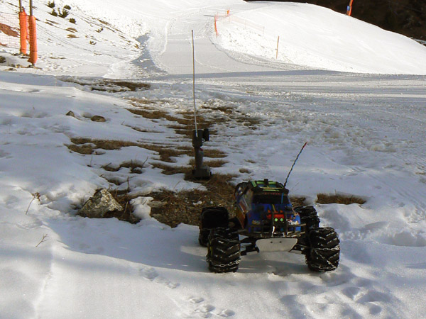Relación 12/72. 7 dobles packs de 3000Mah y uno de 3800 he gastado en esta subida con un consumo elevadisimo ya que el 100% de la ruta es por nieve. Muelles de espiral roja Integy Tmaxx duros, todos con dos anillos gruesos de precarga, se consigue así máxima altura de rodaje, en nieve la suspensión no es necesaria. Diferencial trasero eliminado + MIP Cvd en un lado y en el otro un palier de plastico. - RPM brazos - Robinson Racing piñones. Neumáticos originales Ttraxxas preparados para nieve y hielo con cadenas, clavos y perfiles especiales. Aceite de 300K en diferencial delantero - Cajas diferencial aluminio Megatech . Aceite 30/40 en amortiguadores Bigbore con un agujero en pistón. Posición amortiguadores 1B. Servo Hitec 645MG. 2 Rx packs Nimh 6V * 1400 mah independientes para servo y ventilador. Tx pack 8 * 2500 Sanyo nuevas Nimh. Brazos dirección RPM con rodamientos más grandes y sellados. Bieletas dirección aluminio. MIP CVD atrás. Robinson Racing diferencial. RPM brazos traseros. Bajos súper protegidos, incluidos brazos de suspensión y frontal mucho más ancho que el estándar.