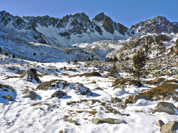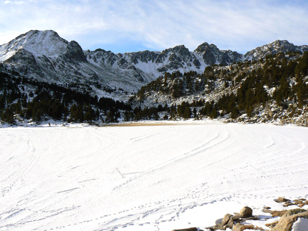El circo de Pessons al final de un magnifico valle con 6 lagos helados. Esta imagen podria corresponder al mes de Octubre o Mayo, pero estamos a 3 de Febrero.