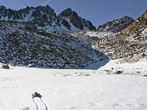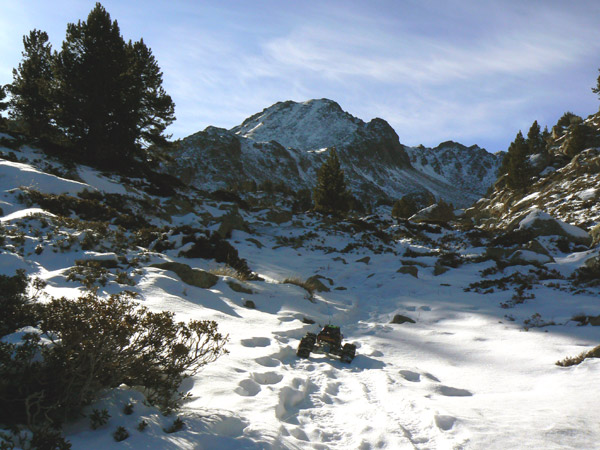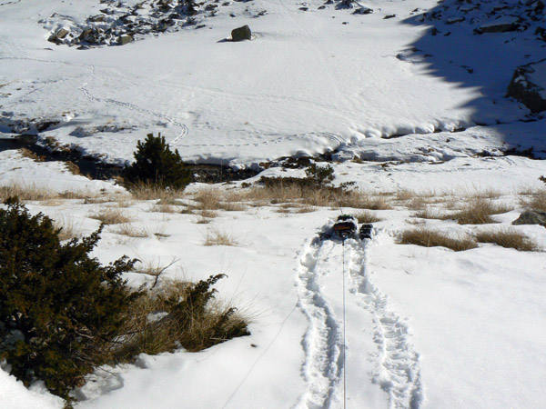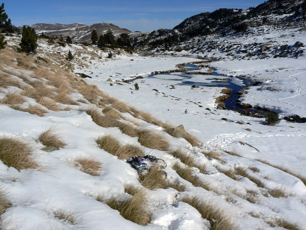 . Ahora si se ve la subida, pero ya para bajarla por la via directa , el lugar con más riesgo de toda la ruta por la presencia de hielo bajo la nieve y por la pendiente . Se cambia el amarre del parachoques delantero al trasero y se suelta. La bajada es tan fuerte que incluso sin acelerar el Emaxx va tirando de nosotros, bueno, paso a paso, sin prisas. Intente la subida anterior para probar si algo más arriba había un camino más sencillo que el que muestra al fondo la foto tomada a la entrada de este valle . De hecho se veían huellas de raqueta que se dirigían a esta zona y desde abajo daba la impresión de que pasara un camino a más altura y manteniendo los 2590 m de altitud hasta el último lago el Estany del Cap de Pessons, debajo del pico del mismo nombre. Habré llegado con el Emaxx a 2560 metros en este punto , nunca más alto con el coche., y para ser invierno, aunque poco crudo este año , no está nada mal. |