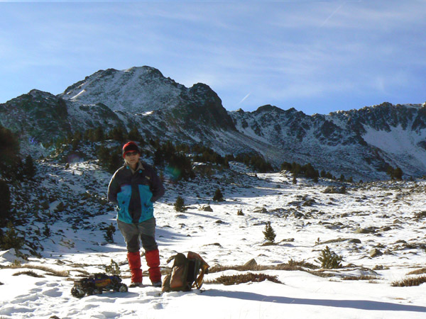 Trucktrial. Equipo de "grandes frios". Aquí me podéis ver después de una carrera de menos de 5 segundos entre la cámara de fotos y la pose con el valle de los lagos y al fondo el circo de Pessons. Empieza a hacer algo de calor, más por andar subiendo todo el rato que por el sol, pero aun así es necesario caminar con chaqueta corta viento y gorro, aunque debajo solo lleve una camisa ligera y una camiseta técnica. Los guantes los llevo a ratos, dependiendo de las zonas, a veces quince minutos para calentar y luego fuera. Llevo dos tipos, los que más uso finos térmicos de ciclismo que permiten pasar los dedos por la emisora y tener algo de tacto y otros muy gruesos por si la cosa se pone fea y no puedo manejar el coche. Los paranieves o polainas imprescindibles, sin ellos no se debe hacer estar ruta. Como siempre para cuando me coloqué los paranieves ya había nieve más alta que las botas de 18 cm. , y se había colado algo dentro. Pantalones de fibra kevlar anti desgarre y calzones largos debajo...Calcetines interiores coolmax y exteriores especiales bota montaña con refuerzo y sin costuras. Llevo también en esta ocasión crampones aunque en realidad no harían falta hasta más adelante, en un par de lugares cercanos al lecho del río. A esta altura es muy frecuente que la huella dejada por el Emaxx este a la altura de 1/3 de rueda. No problem aún, pero se nota que el consumo es mucho mayor y le cuesta avanzar