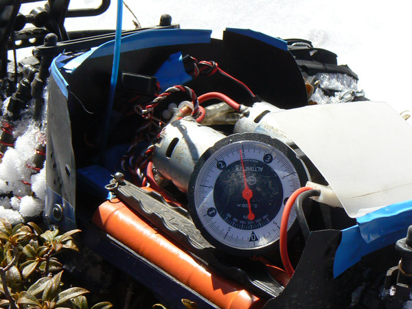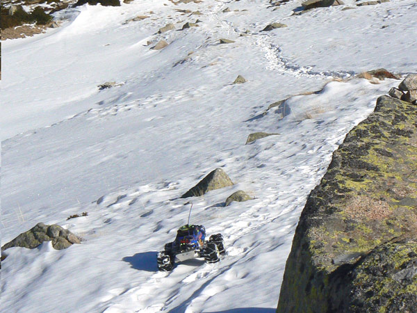 Ultima bateria. El gasto de baterias en estas condiciones es casi el triple que en nieve normal, no estoy seguro ya de llegar abajo. Extenuado? No, todavia no , pero mirar como andaba la rueda del emaxx en la última parada. Esto es muy cerca de donde la roca helada que mostraba en la quinta foto de estas pagina. Nada que ver. El Emaxx no puede hacer girar eso, a la media vuelta se crece el doble. La solucion es levantarlo del suelo, meter segunda acelerar a fondo para desprender la bola y rezar por encontrar una huella mas dura al soltarlo. Es una nieve muy pesada, humeda ,pegajosa, no hay neumatico que supere esto, solo cintas orugas y nuy anchas, con muy poca presion sobre estesuelo de algodón podrían funcionar aceptablemente. |