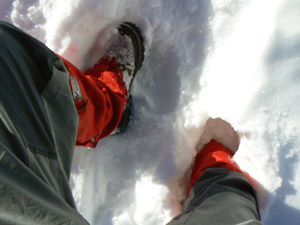 Los hundimientos A esto me refería cuando hablaba de levantar una pata para dar el siguiente paso y de repente hundirnos con nieve hasta debajo la rodilla. Es más cansado caminar así mucho rato que todo el tiempo hundiéndote , cuando ya sabes lo que te espera en el siguiente paso. Basta con alejarse media docena de zancadas de la ruta normal que sigue el coche para comprobar la profundidad de la capa y su estado. Realmente muy variable e impredecible hasta cierto punto. |
