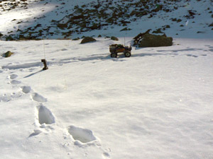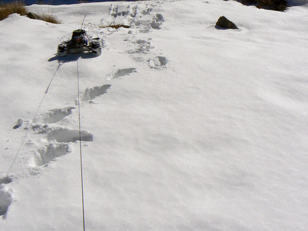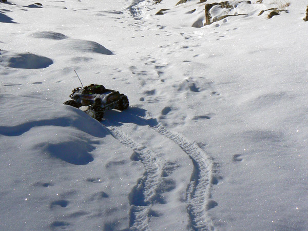 Nieve dura, media, y blanda. Así es como encontramos la nieve a cierta hora de la mañana, con el sol calentando desde hace tres horas. Ya sabemos que nuestros pasos pueden hundirse a veces hasta medio metro pero nunca nunca sabemos exactamente cuando va a suceder, suele ser cuando ya damos el paso pro terminado, levantamos el otro pie y empezamos a avanzarlo. Entonces de golpe te encuentras dos palmos más bajo y lo único interesante puede ser aprovechar la pose para hacer algunas fotos .. Lo malo es que andar así cuesta bastante y ya es la segunda caminata en la que al tener que levantar tanto los pies para el siguiente paso se me agarrota un poco el muslo derecho. El Emaxx avanza normalmente y tiene más posibilidades de no romper placa y flotar sobre ella, pero también y cada vez más a menudo se mete en zonas que inexplicablemente están mucho más blandas, sólo hay que mirar la huella que estaba dejando al hacer esta foto y de repente como hunde la delantera. Puede salir de esta situación, pero le cuesta, como si tuviera que empujar toda la nieve hacia adelante.