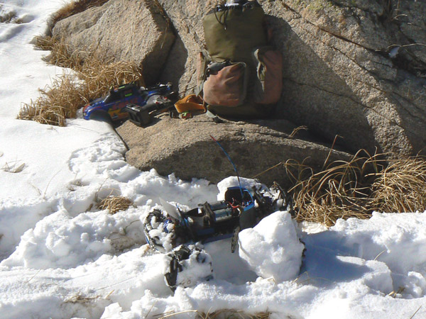 Un pequeño descanso. Es la primera parada decente que hago desde el bar restaurant de los 6 Euros el pequeño trozo de pastel y café con leche , sí el de Van Morrison. Saco mi arsenal de pistachos, almendras, cacahuetes, queso, el isostar y demás vicios comestibles y aprovechando una mata de hojas milagrosamente escapadas del hielo me siento a cargar mis pilas para toda la semana y a secar el Emaxx. Antes pensaba que estos parapetos de plástico que llevo para impedir la entrada de nieve al interior eran algo cutres pero es que aun no había visto los trozos de tetrabrick con velcro que lleva en su emaxx el usuario r5biturbo y de los que se atrevió a poner una foto en el foro de cochesrc. Te pasaste cuatro pueblos r5biturbo ah ah,! Del pequeño tejado para el ESC de un tuperware que mi mujer aun anda buscando ya hablaremos otro día. Son MUY muy efectivos, mirad en la nieve y hielo que cubre totalmente las baterías para receiver delantera y trasera, en las dos torretas , los diferenciales, las tabicas y los brazos de suspensión y que en el interior no hay absolutamente nada de humedad.
