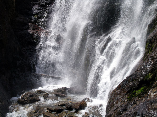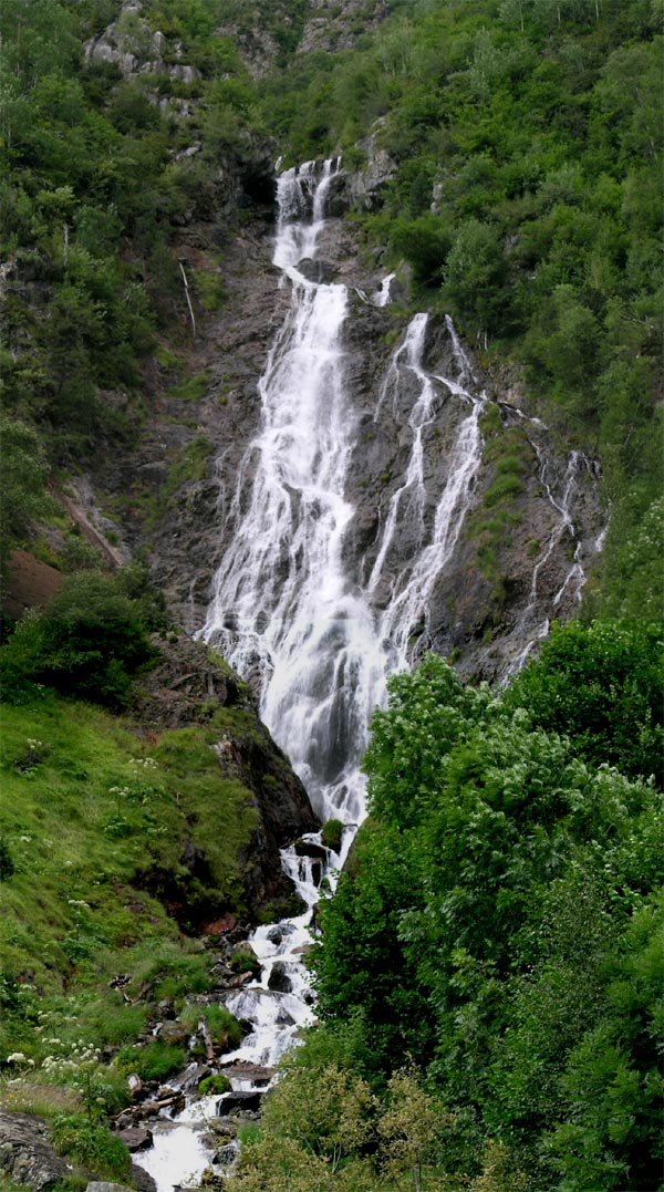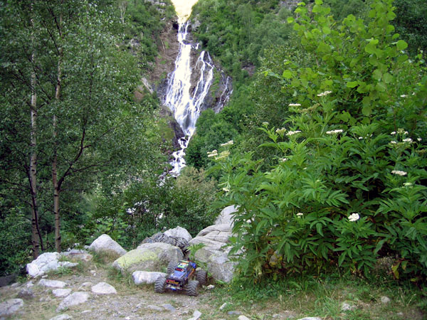 Cascada de Espigantosa , inicio del camino Casi podemos contar con que el camino al refugio Ángel Orus empieza en este lugar pues desde aquí al parking donde dejamos el coche hay una pista con grandes cantos rodados que pueden sortear sólo los 4 x 4 más decididos. El Emaxx sube sin problemas en segunda ese tramo de pista saltando de piedra en piedra , sin entretenerse en hacerme tener que decidir si evitarlas o subirlas y bajarlas, casi como si fuera llano para el coche.. En esta época del año , finalizado el deshielo debería bajar poca agua sin embargo algunos glaciares permanentes que todavía quedan en los Pirineos siguen aportando buen caudal a este salto .