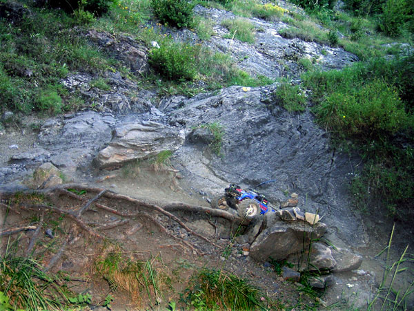 Por los atajos. Tal y como vimos en anteriores rutas ,caminos hay para todos los gustos y es normal que en itinerarios transitados existan variantes de todo tipo al trazado principal. . Después de un buen rato subiendo por bosque y rocas a veces me apetecía coger atajos como este para llegar a la siguiente curva. No es que se tarde más o menos ni que sea tanto o más difícil que el camino normal, es simplemente por probar cosas nuevas y aprender. Me entretengo tres y cuatro veces con un pequeño paso de estos y como me convenza de que esto es "una zona para hacer a cero faltas", no me voy de ahí hasta que lo consiga. Este que se ve en la foto es el típico atajo corto de los que se suben a golpe de gas desde muy cerca se gira un poco y enseguida se corta gas para que no encabrite, apenas hay espacio para ganar velocidad y poco sitio para maniobrar. Una vez te metes en la zona es mejor tenerla bien estudiada. No suele haber tiempo de decidir una vez dentro si tienes intención de pasarlas a cero. |