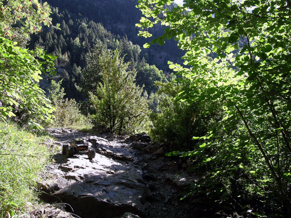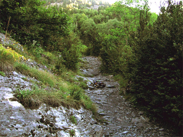 Dentro del Bosque. Seguimos durante un buen rato entre el bosque , tramos más sencillos alternan con otros de roca mas técnicos y con algunos cursos de agua que atraviesan el camino o lo siguen durante unos metros. En realidad es un camino variado que nunca llega a cansar y que incluso llegas a desear que se prolongue un buen rato antes de llegar a las temidas tarteras de piedra que tanto abundan en estos valles Pirenaicos, producto de la descomposición y erosión de las laderas. Casi todos los valles cercanos presentan caminos con mucha piedra . Esta es mas notable a partir de 2100 metros cuando los bosques tienden a estar menos poblados . Entonces, piedras que van desde tamaño nuez a tamaño aguacate salpican el camino mezclándose al azar y hacen que seguirlo con el coche necesite su tiempo, más que andando por supuesto. Hasta esa altitud la mayoría de recorridos son de fácil curso para un Emaxx mínimamente preparado.