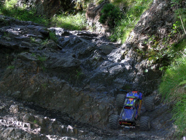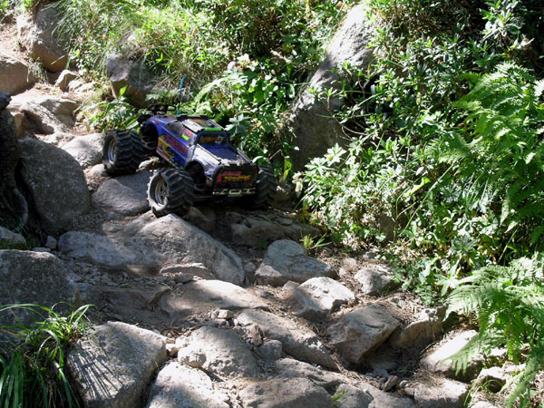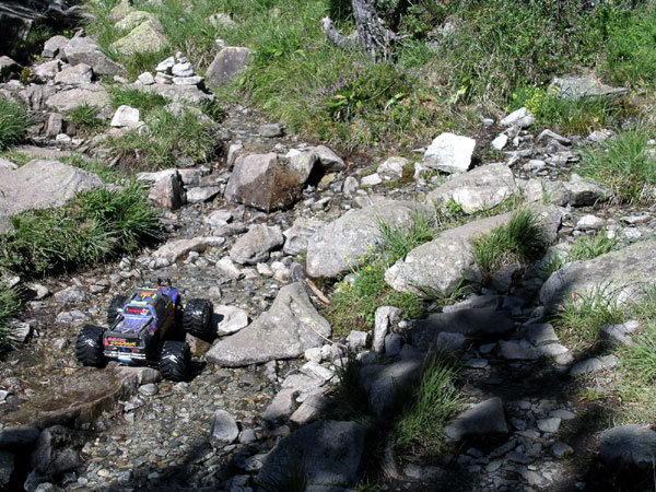 Es una subida es una subida !! Aunque para la ocasión el Emaxx esté cabeza abajo se supone que el camino es eso que se ve delante del Emaxx entre rocas y bloques bastante grandes de piedra . Aquí el camino es algo duro y puede llegar a ponerse pesado . Es necesario poner algo más de atención y pensar en el trazado correcto unos segundos antes de llegar a un obstáculo Aun no es necesario avanzar por turnos como en otras rutas , es mejor si hay tiempo que suba primero el piloto y luego que "tire" del coche hacia arriba. No hay que preocuparse tampoco en exceso por esas piedras grandes, a menudo son más inofensivos que los medianos ya que no caben entre las dos ruedas y con unas buenas baterías se suben a golpes de gas saltando de una a otra sin ningún cuidado, que este Emaxx ya está curado de espantos y yo curtido en estos pasos.