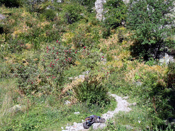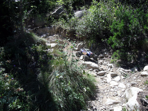 Camino invisible. en Poco después de salir a una terraza de situada un poco más arriba en este hermoso valle de Eriste/Grist llegamos a este paso en el cual deberíamos girar y volver. Esa era mi intención pero ya que había llegado hasta aquí tras hora y media de subida no quería dar la vuelta sin intentarlo. No hay fotos de esa subida entre las zarzas. No hay tiempo ni apenas espacio para sacar la cámara y hacer fotos una vez te metes ahí , es difícil parar y reemprender la marcha, desde que decides entrar hasta que sales apenas sueltas el mando. Hay que fijarse mucho en la foto para intuir el camino, lo único cierto es que hay que llegar arriba , ascendiendo unos cincuenta metros y que se consigue en tres o cuatro zigzag muy pronunciados por camino malo lleno de escalones y vegetación. Que el Emaxx los pase más o menos graciosamente dependerá como otras veces del tiempo que queramos dedicar a superar las rocas en mitad del camino. Últimamente no estoy tanto por la labor de trial extremo, en cuanto la dificultad es muy grande cojo el coche y literalmente lo lanzo un metro o dos más adelante para sortear el obstáculo. De todas formas es raro encontrarnos obstaculos en un camino que puedan poner en apuros a un Emaxx..