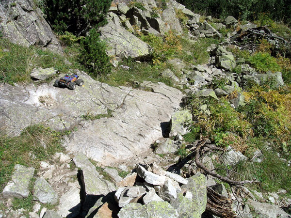 Bajando, saltando, corriendo y brincando. Pista! Parece que cuanto más abajo y cerca del final estás más corre el coche y más veloces se mueven los pies . Empiezas a pensar en el recorrido que has hecho, las dificultades, las sensaciones, pones el automático. Suena raro eso de poner el piloto automático llevando un RC monster truck , pero es así. Este es uno de los tramos de bajada interesantes que se empieza haciendo por tramos cortos y se termina a toda velocidad. Al principio hay que prestar unos segundos de atención a tus pasos , colocarnos en una posición más o menos estable en plena pendiente y decidir el paso del Emaxx. Después ocurre que vas confiando cada vez más y bajas a saltos , casi corriendo tras el coche.. Cerca de mí y un poco atrás bajaba un alpinista, íbamos relativamente rápidos y yo ya ni siquiera me detenía antes las piedras, daba gatillo y volaba. Incluso en sitios donde sabia que iba a volcar aceleraba a tope en primera para saltar y caer un par de metros más abajo. Eel Emaxx que ni se inmutaba, más gas le daba más fino iba, confianza total.