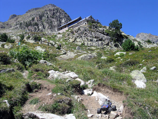 Refugio Ángel Orus a la vista . Tras una de estas curvas de dura pendiente se llega a una elevación desde la que ya se ve el refugio. Aun queda subir esta cuesta final, nada sencilla por cierto, pero una vez llegados hasta aquí no nos va a importar nada superar estas pequeñas piedras de nada. De verdad que al verlo me entró la tentación de decirme "bueno ya estamos casi en el refugio, ya puedo regresar", pero no, a pesar de haber estado el día anterior ( y haber pagado 6 euros por una cerveza no muy fría) volví a subir y darme unos rodeos un poco alejado del refugio en la parte trasera e intentando adivinar y seguir el camino al Pico Posets, segundo de los Pirineos con 3365 m (11,030 pies) de altitud si no recuerdo mal. Hasta éste magnífico refugio sólo se llega andando, en helicóptero - hay una plataforma especifica para ello - o con el Emaxx. :0) Podrían adecentar un poco el acceso final a un refugio tan elegante, pero parece que es mejor así, una entrada fácil parece que no seria bien vista por muchos rudos excursionistas. |