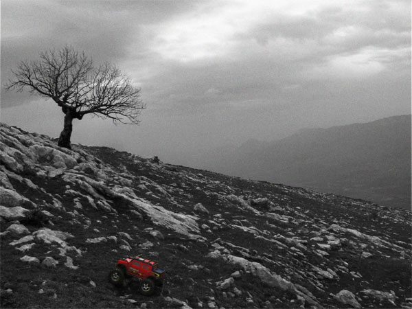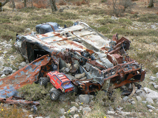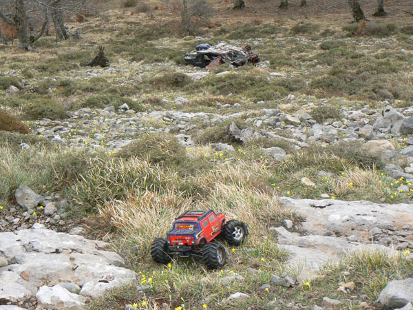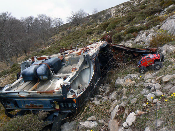 Coche Hay un covhe siniestrado en la ladera a unos 60 o 70 metros por debajo de la pista que asciende a la cima e instalciones de telecomunicacion. Desde esta distancia nos e distingue el modelo o marca . solo un monton de hierros oxidados panza arriba . Pienso que ha salido de la pista por una zona sin valla y ha llegado dabdo vueltas hasta qalli. Bajo con el Emaxx por una pendiente fuerte, asegurado con la cuerdecilla y a veces por tramos. |