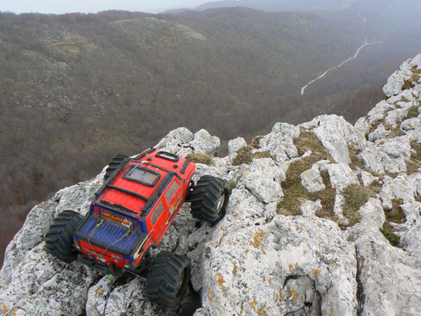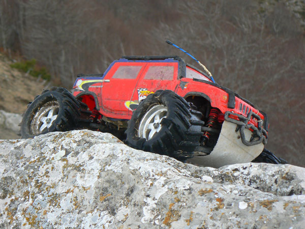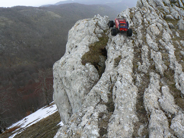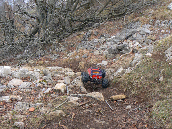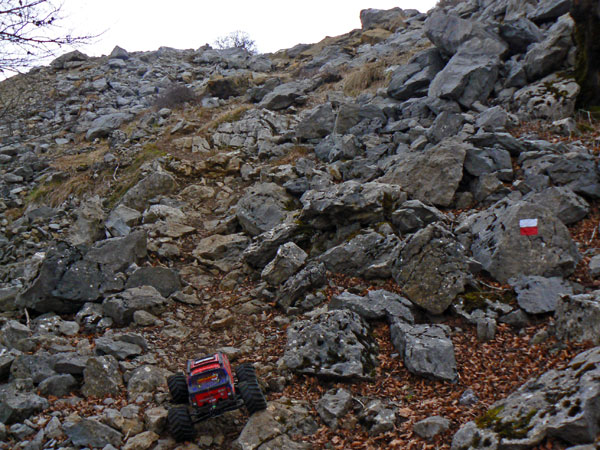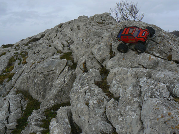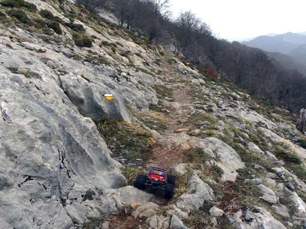 Eso es cerca del parking que hay en una curva antes de llegar a San Miguel. Hay unas vetas de piedra sobre las que se pueden inventar un gran numero de zonas. al pco ya habia hecjho cinco o sesia psadas cada vea a mayor altura, se trataba de pasar pro la parte mas alta y dejar una marca en el punto mas bajo, y en cadas pasada intentar mejorarlo. En primera pos supuesto, y con estos dos motores Integy que lleva, se puede girar muy despacio y controlar muy bien la posicion giro y orientacion de las ruedas. Lo vemos en la siguiente imagen . |
