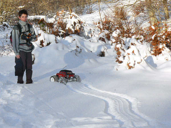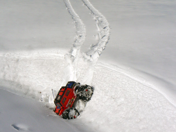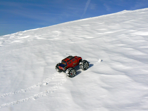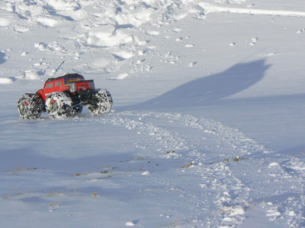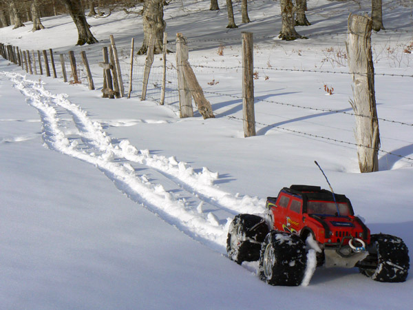 El Emaxx, este modelo de coche de radio control. sigue sin inmutarse las instrucciones de la emisora como si esto de la nieve le fuera ajeno .