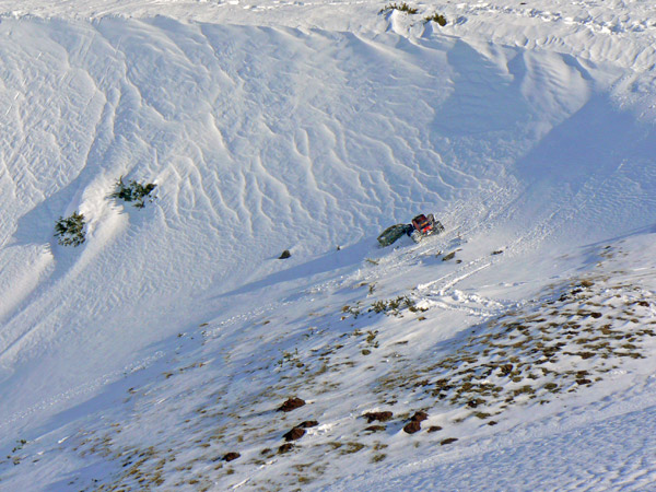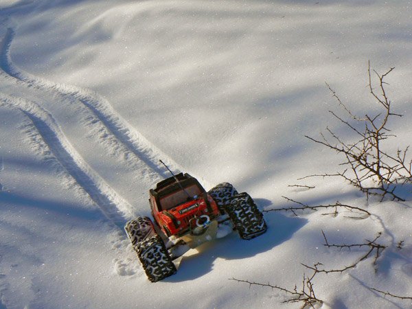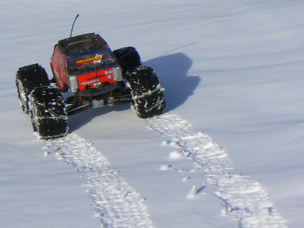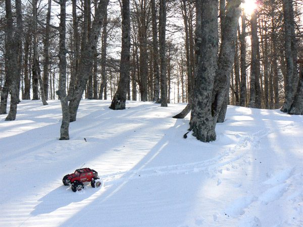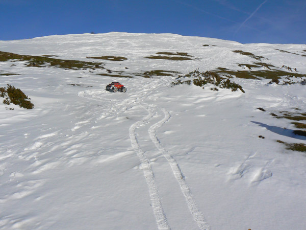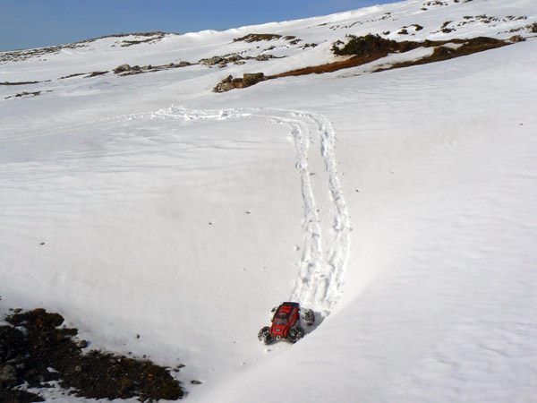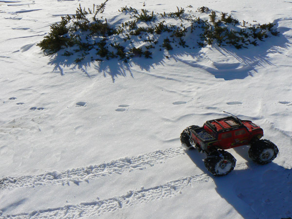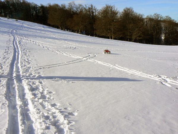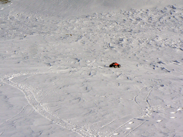 La nieve esta perfecta para andar con el coche que deja huellas precisas y sin derrapajes durante las lazadas que le hago seguir para obtener si cabe mas traccion y velocidad de ascenso.