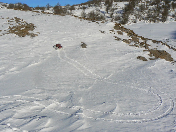 Estos neumaticos que he preparado van como la seda en este terreno, y cion nieve mas dura como la cde la imagen aun mejor, suben por pendientes bastante fuertes, pudiendo detenerse en mitad de la pendiente y arrancar nuevamente sin apenas deslizar.