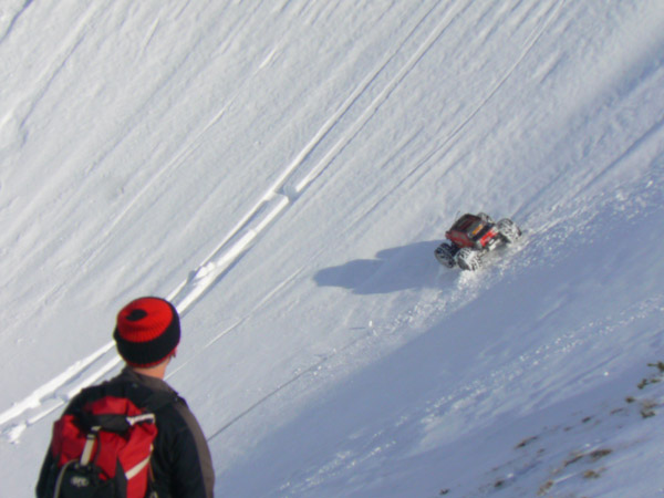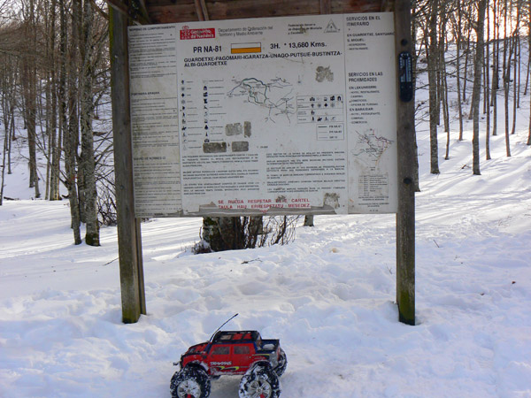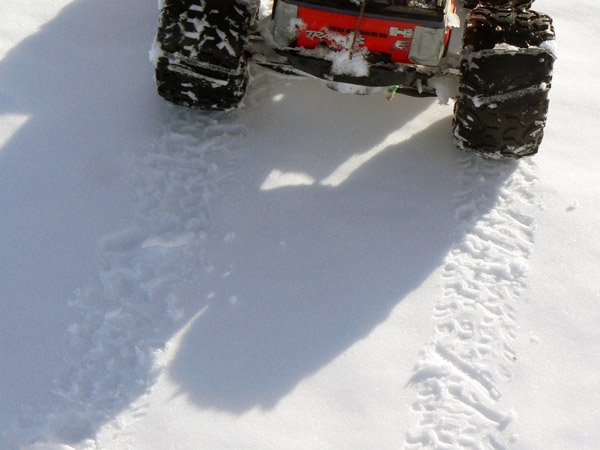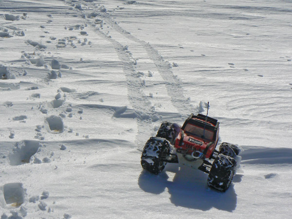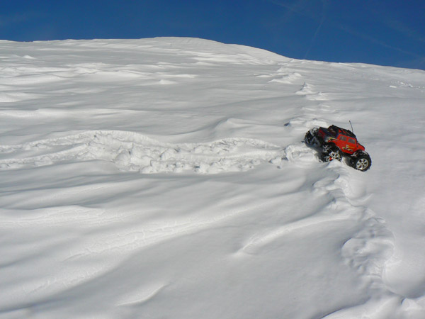 Ocurre a veces , como aqui que la nieve es blanda para nuestras botas - y los 90 kilos que llevan encima... pero sin embargo sostienen al Emaxx.