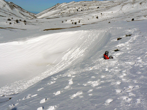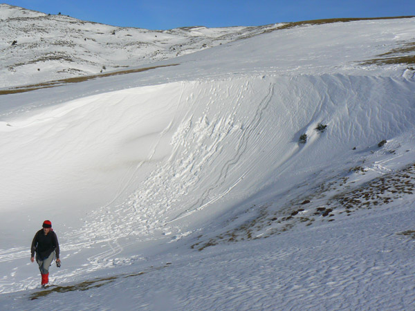 Es probable que aqui debajo haya alguna veta de rovca o hierna crecida que haya ayudado a retener la nieve arrastrada por la ventisca.