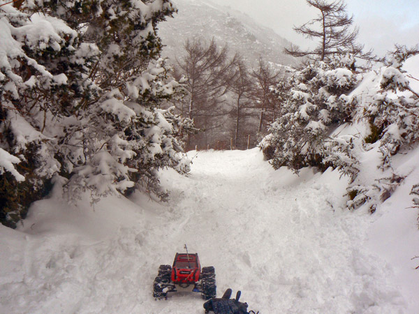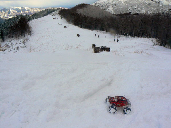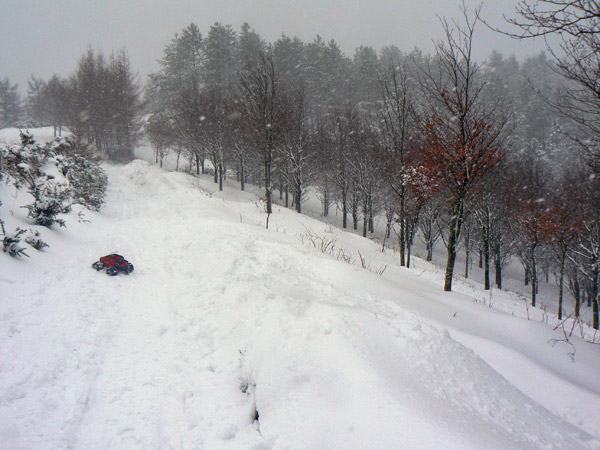 Atracon de nieve Por fin llegamos a un tramo que es todo lo contrario del anterior. Muchísima nieve, muy blanda y el Emaxx que ya no puede subir por sus medios, las dos ruedas quedan cubiertas.