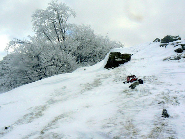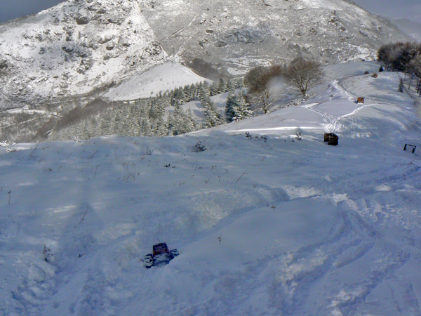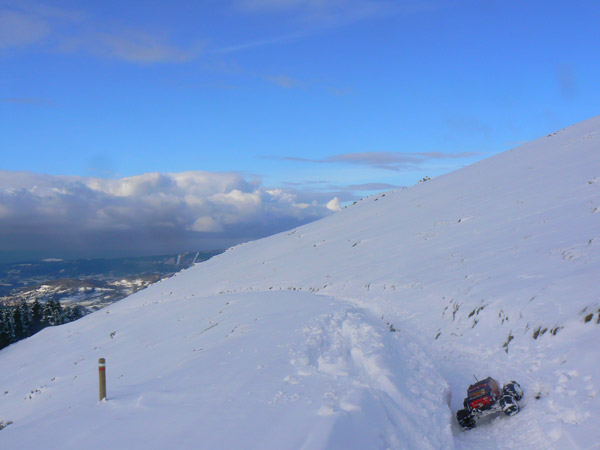 Subiendo laderas de Biandiz En este punto habremos ya subido 350 metros desde que dejamos el coche en el refugio de Aritxulegui . El viento ha levantado la nieve y quedan unas placas de huelo quebradizo sobre la hierba. Estas placas son muy buenas para subir con el coche, recordemos que lleva clavos y cadenas, y hay que ir buscando que el Emaxx pase por encima.