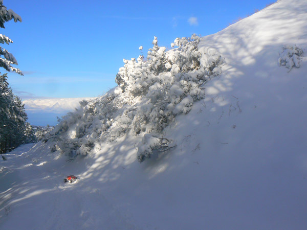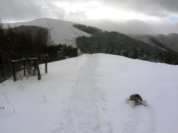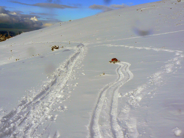 Abriendo huella Otra huella en realidad, no es que haga falta, pero en bajada el Emaxx arrastra lo que encuentre por delante. Estoy tentado de subir la loma que vemos a la derecha y bajar directo, pero el estado de la penúltima batería no me convence y decido seguir por la ruta de la pista, ahora totalmente cubierta. Se adivina una evidente mejora del tiempo, nos acercamos a mediodía y el sol empieza calentar las capas superficiales, ya hay tramos por donde la capa superior esta muy húmeda y resbaladiza.