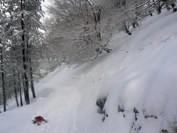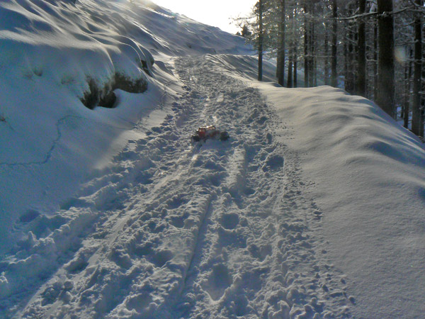 Inicio de la cuesta Estamos en el punto de arranque de la segunda cuesta fuerte, la que veíamos en la anterior imagen tras el bosque, Empieza con nieve grumo levantados por los pasos de bota, esta parcialmente helada y da mejor agarre que andar por nieve virgen. El coche de radio control responde a la perfección, acumula mucha nieve en las llantas y en los bajos se ha formado ya el típico patín de nieve endurecida que facilita el deslizamiento.