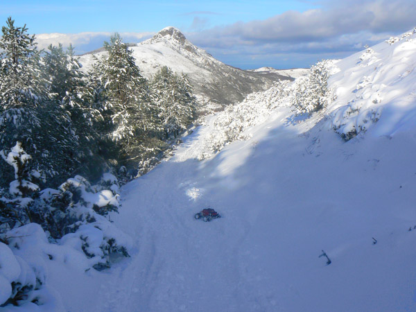 La pista En este lugar había que decidir si subir directo la cuesta de las vallas o rodear y subir en diagonal por esta pista. Ya lo estuve mirando un rato, ya, pero la cantidad de nieve acumulada y sobretodo lo blanda que estaba me hicieron tomar el camino más fácil. Más fácil que la subida directa si, solo como comparativo, con unas huellas tan marcadas hay que ir buscando por aquí el mejor pasó. Se avanza en segunda, consumiendo muchísima batería. |