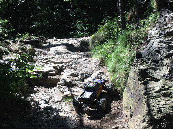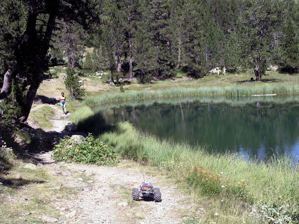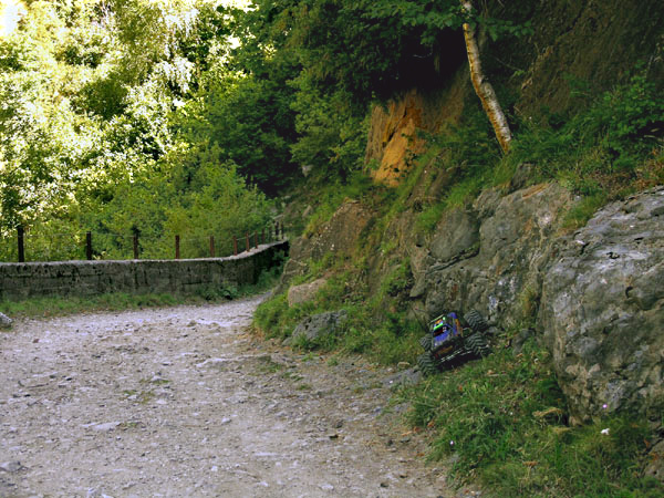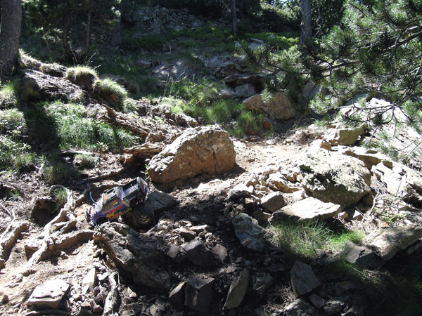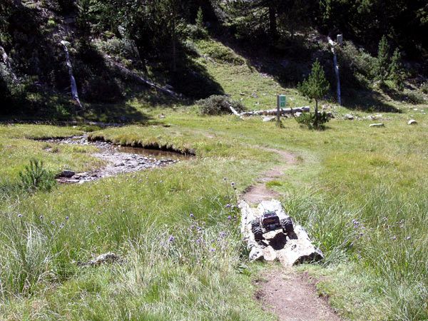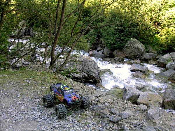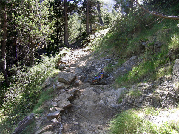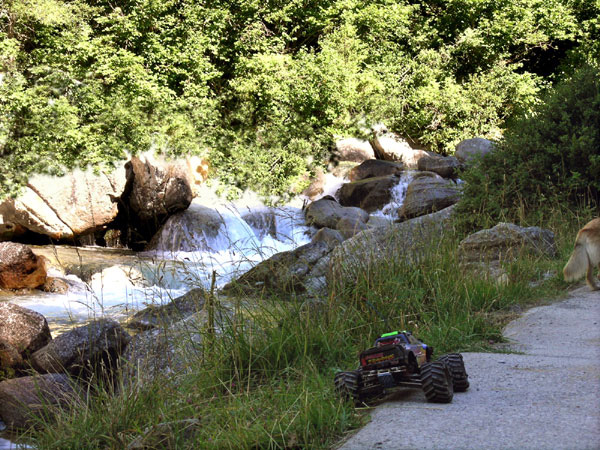 Siguiendo curso del río Estós. A pocos Km de Benasque por la carretera a Francia se encuentra el desvio hacia el valle de Estós. Es una pista forestal bastante estrecha y cerrada al publico, que nos acerca al refugio de Estós, uno de los puntos de ascenso al segundo pico mas alto de los Pirineos, el Posets y a otros como el Perdiguero, Bardamina o Clarabide. Durante unos pocos Km no hay mas opción que seguir por esta ruta con el Emaxx , afortunadamente el recorrido es fantástico y de gran belleza , cercano algunas veces al río y otras subiendo decidido por las paredes del valle. Siempre va bien alguna carrerilla por tierra en segunda velocidad aunque sea para dejar descansar un poco al variador y airear un poco los motores.