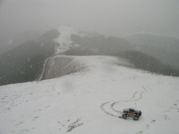 Me siento un poco raro aqui arriba, en medio de la nevada, con un monster truck de RC. Un poco mas alto o en el mismo sitio - no recuerdo- , pero aun en la primera pendiente que se veia en la foto anterior, arrecia la nevada y dudo en sacar la camara de fotos de su funda. Tambien pienso si no seria mejor regresar ahora abajo antes de que se empiece a liar la cosa y me encuentre a una hora de camino. No se puede ir cara a la nieve y a contra viento , es mejor ir ladeando y buscando giros suaves . Algun escaloncillo pone un poco en apuros la primera marcha, por ser demasiodo corta ( 12-72 en esta ruta) y no conseguir bastante velocidad. La segunda se queda un poco larga y va demasiado rapida para este tipo de subida y para mis patas, no puedo seguir su ritmo de ascension en 2ª |
