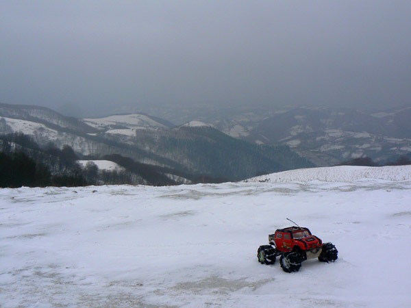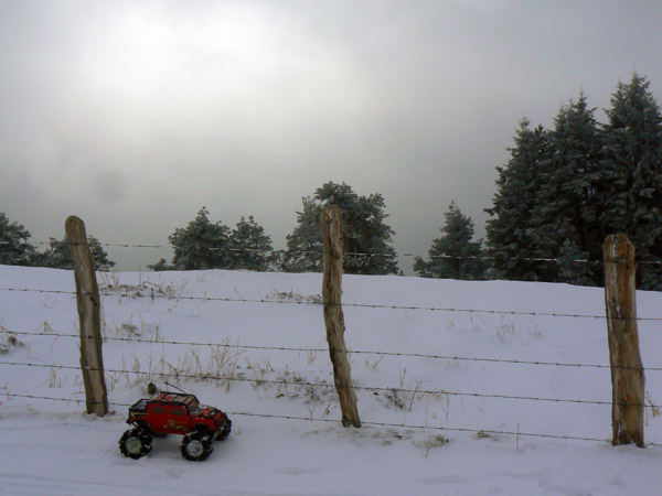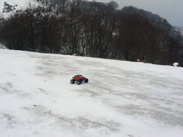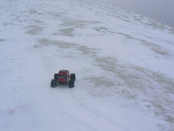 Esta es una de las "rampa los trineos" mas concurrida los domingos, este sábado aun no han llegado y me lanzo enseguida a la intemperie antes de que lleguen los Queguay y los Quechulo Cambiarse dentro del coche a 23º para salir a practicar este hobby y viendo -5ºC en el termómetro exterior es toda una hazaña, botas, polainas para la nieve, guantes, cortavientos, pasamontañas, comprobar emisora y servos, nada debe dejarse al azar. Esto es un tractor, con un enorme motor diesel a muy bajas revoluciones y funcionando con una suavidad que solo un motor eléctrico con escobillas puede dar. Comienzo con una de las nuevas baterías Turnigy Lifepo 3s2p, uno se acostumbra pronto a lo bueno, especialmente después de sufrir durante un par de años los caprichos de la tecnología NiMh. Como ya comente en la primera prueba todo se puede subir en segunda velocidad, lo que no esta claro es que tengamos fuelle para seguir el coche a 11 o 12 Km. por hora en una subida larga. Encontraremos afortunadamente muchas placas heladas que nos facilitarán la subida. |
