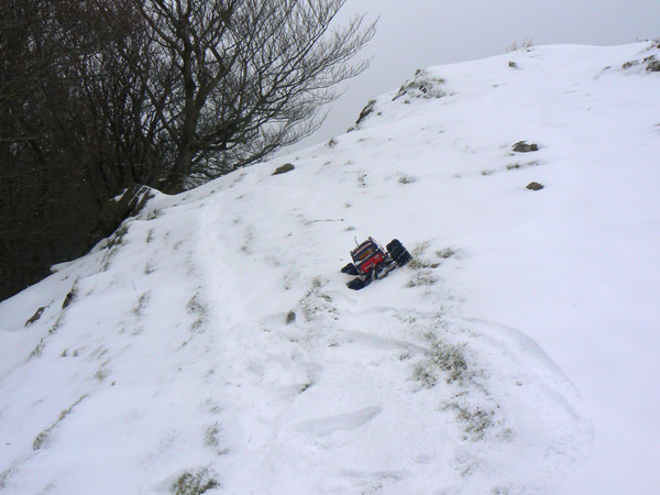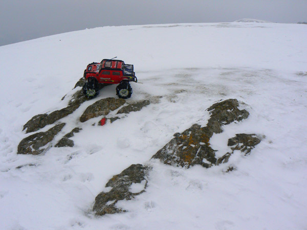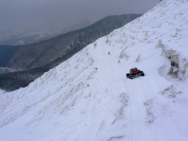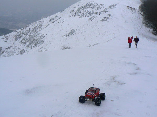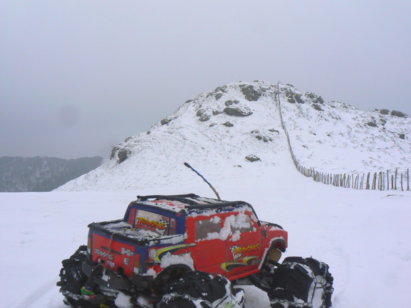 Segunda Rampa Tras la primera elevación viene una ligera bajada, la que vemos al fondo, un colladito y otra subida media. Los que me van a pasar creo que son los del 4x4 real que llegaban al aparcamiento casi al mismo tiempo que yo, no terminan de comprender como avanza el emaxx pero ahí sigue, despacito de hielo a hielo y sigo por que me toca. |