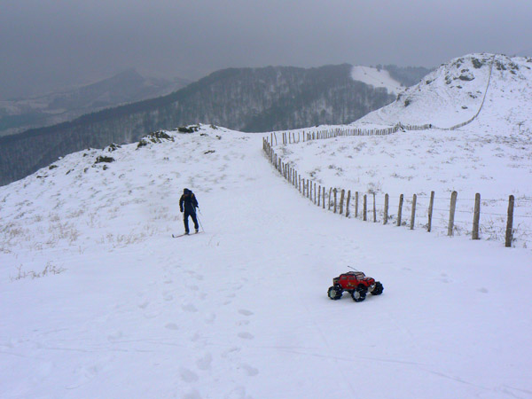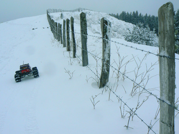 El vallado de la finca de Articutza. Esta valla sigue kilómetros y kilómetros el perímetro de una propiedad del municipio de San Sebastian fuera de su término, contiene un embalse que suministra agua para la ciudad y una de las zonas con más pluviometría de la península. Para subir a la cima del monte Bianditz desde el collado del mismo nombre en la carretera a la entrada de la finca debemos seguir si o si esta valla, mas o menos cerca pero presente casi todo el rato a nuestra derecha. No falta ya mucho, llevamos algo mas de media hora, quizás 45 minutos entre paradas y fotos, aun con la primera batería Lifepo de 4500 Mah y subiendo mas del 90% en segunda velocidad a muy pocas Rpm, incluso en los tramos mas hundidos. La batería responde bien al frío, los primeros 20 minutos dando el tope de descarga y a partir de ahí una línea constante de voltaje, algo menor que la inicial pero sin notar progresiva disminución. En esta parte el viento ha compactado la capa que aun siendo nieve polvo parece aguantar bien el peso del Emaxx que entre nieve, agua en las esponjas de los neumáticos y baterías debe andar por los 7 Kilos.