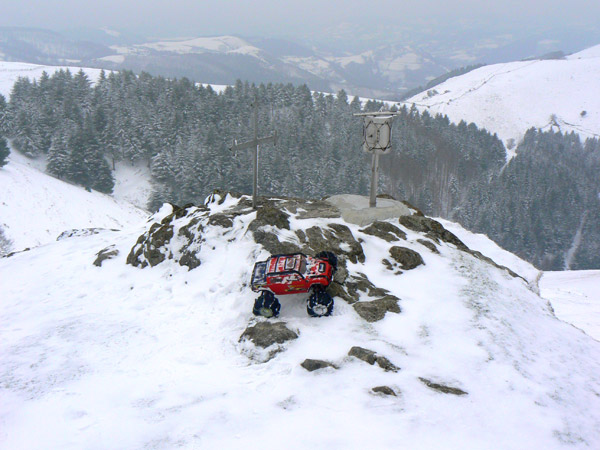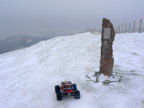 Ultimos metros para cima. El vértice geodésico, regente si no me confundo, afea la cumbre al lado de otras obras de parecido mal gusto. En mi opinión, claro. Estaremos a 845 de altitud solamente pero podremos ver el mar. A solo 8 kilómetros y buena parte de la costa guipuzcoana. En peores condiciones de nieve he subido esta cima con el modelo de radio control, una de ellas tirando como un mulo del maldito coche atascado hasta el capó en nieve blanda. Pero hoy es subir y conducir casi con una mano y el codo apoyado en la ventanilla, no se ve en la foto porque voy en el otro lado. El hielo se desprende de la ventanilla y queda colgando en el plástico, vamos decididos a por esas placas de nieve helada y enseguida llegamos arriba.
