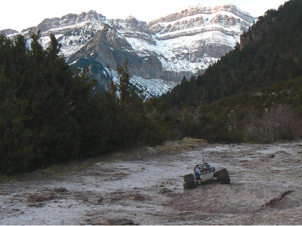 31-12-2006 Rc Hiking trails Esto es una imagen de uno de los picos cercanos. Estamos en un pequeño aparcamiento desde donde se inicia el camino a Canal Roya y barranco de Chinipré. En la N-330 a 3 Km de Canfranc direccion Francia y muy poco antes de las estaciones de esqui de Astún y Candanchú. Las 8 y media de la mañana y cuatro bajo cero para empezar. La tierra como si fuera toda de piedra , el agua como vidrio. La helada es impresionante, aun asi me arriesgo a seguir con el coche la pista forestal de 2 Km que nos adentra un poco en el valle y ahorra un aburrido ascenso llevando el Emaxx . La pista esta en mal estado , digamos que muy poco apta para un turismo alto . Es necesrauio atravesar varios vados con hielo y tramos con mucha piedra , bastantes de estas con suficiente tamaño para dejar un buen recuerdo en el carter . Un chichon ya se llevo bajo una puerta pero fue a la bajada. Al poco llegamos a un pequeño refugio en donde termina la pista 1/1. cambio de ropa botas guantes ... Emaxx al suelo, antena y gatillo. |