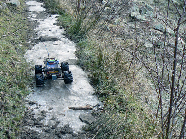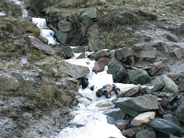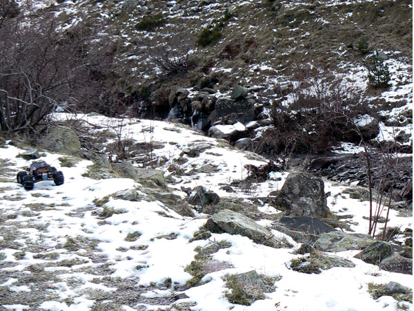 Todas la baterias a rebosar, mientras venia por la carretera iba cargandolas a tope, estan pues calentitas y envueltas en un calcetin dentro la mochi para que no se enfrien :) . Pues asi trascurre mucha parte del primer tramo, por la orilla derecha hidrografica del rio y en este estrecho sendero que a veces ha sido arrastrado por algun alud hacia el fondo. Esta es una zona bastante propensa a aludes por ser un valle encajonado y con fuertes pendientes sin vegetacion a ambos lados, sin embargo este año hay muy poca nieve. Por lo que parece desde abajo, el manto de nieve continuo empieza a unos 1800 m y segun los ultimos partes a unos 2000 metros debe haber una sola capa bien adherida de unos 5 o 10 cm , helada superficialmente. Se dan pues las condiciones ideales para la practica del RC. :o) Estos pasos de hielo, cada vez mas frecuentes los hace el Emaxx por el medio y yo intentando evitarlos, un poco sobre hierba. No es que las cadenas ayuden mucho en este tipo de hielo tan duro pero tengo clarisimo que sin ellas no seria posible avanzar , o lo haria con mucha dificultad. El servo parece que gira poco a la izquierda , a ver si es que el tornillo de engarce con la barra se ha aflojado y toca el chasis como en la subida al Moncayo. Estoy preparando unos neumaticos mixtos de nieve/hielo con clavos y cadenas que van a funcionar de maravila, en cuanto pille unas llantas los probare.