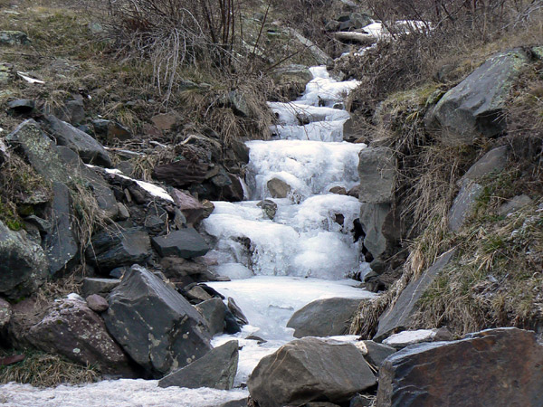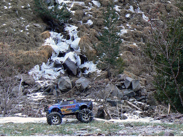 A medida que vamos siguiendo el curso del río hacia arriba va cambiando el color del sendero . Estamos a muy poca altitud todavia, segun el altimetro a unos 1550 m, pero las manchas de nieve ya estan cada vez mas juntas. En la otra orilla pequeñas cascadas de hielo detienen los afluentes en una imagen bien extraña. Despues de un buen rato me doy cuenta de que apenas hay ruido de agua. Como va a haber si estan todos paralizados. Es una situacion que se me hace rara, en medio del valle junto a un arroyo y sus afluentes saltando entre piedras y ningun sonido. Alguno de los cachos del camino que pasan bajo ramaje del bosque no estan helados , solo granizados, asi que al Emaxx le toca meterse por una especie de mezcla de agua y hielo de consistencia inpredecible. A veces se hunde hasta la panza, bajo velocidad y procuro pasarlo con poco alboroto , no sea que algun salpicon vaya donde no deba. No se si puede llegar a helarse el agua de las esponjas de los neumaticos, pero no seria nada bueno, seguro. Solo recuerdo que me haya pasado en una ocasion, y fue tras cambiar las baterias y descansar un ratillo a bastantes bajo cero. |