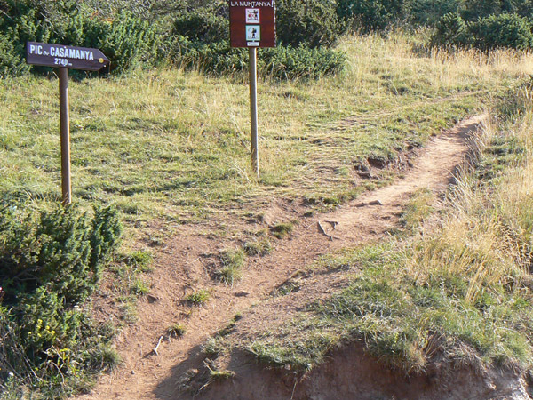 Accesos: Andorra, Ordino, Col d`Ordino. En Andorra desde la población de Andorra_la_Vella tomamos dirección a La Massana y desde ahí a Ordino, entrando en esta última población encontraremos a nuestra derecha una carretera turística que indica Coll de Ordino y Canillo, otra población situada más al norte. Ésta carretera alcanza casi 2000 m de altitud en su collado y suele permanecer cerrada durante algunos meses de invierno ya que existen otra más transitada siguiendo el valle de río Valira a menor altitud y atraviesa el país. Esta foto está tomada al lado de la carretera, en el Coll D`Ordino y como veis en el mismo punto donde dejaremos el coche 1/1 aparcado, pondremos el Emaxx en marcha y ya no lo volveremos a parar hasta dentro de 4 o 5 horas. El cartel indica el evidente camino, bastante concurrido algunos domingos de verano y también la altitud, 2740 m. Éste es el pico más alto de Andorra central, aparece como un monte solitario y destacado en medio del país y desde el que se divisa una magnifica panorámica del Pirineo. Deberemos cargar agua suficiente para beber pues no encontraremos otra en toda la ruta y toda la subida una vez dejado a tras el bosque lo haremos bajo el sol. Hay que prever también algo de abrigo, vamos a casi 2800 m y puede haber un cambio de tiempo - como sucedió - para encontrarnos arriba con solo 8 o 10 grados C de temperatura en al cima. |