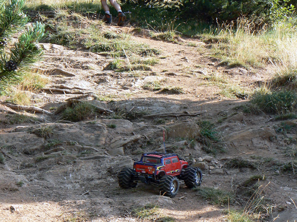 Se acerca la 1º dificultad Tal y como comentaba al principio de esta colina, la imagen decía poca verdad de su pendiente. Aquí si apreciamos más la fuerte rampa central poco antes de llegar a la zona intermedia de piedras. Recuerdo este tramo como especialmente cansado ya que no podía parar el Emaxx . Al reemprender la marcha patinaba bastante y era mejor intentar mantener una progresión constante, aun a costa de resultar algo más difícil. Es un tramo mixto como veis, piedra viva y piedra suelta sobre tierra bastante fina. Lo mejor en estos casos es hacer una parada cerca del coche, examinar los veinte o treinta próximos metros con atención y lanzar el coche arriba permaneciendo quietos hasta el momento que la lejanía ya no permite guiar al coche con total seguridad. Tengamos en cuenta que ni incluso estando detrás en la vía de caída, un vuelco en la parte alta será fácil de parar, un bicho de 5 Kg. bajando y dando vueltas sobre si mismo a toda velocidad no se detiene fácilmente poniendo el pie delante.