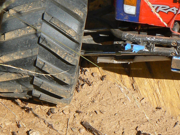 Increíble la cantidad de hormigas que pueden acumularse cerca del Emaxx en una pequeña parada para beber agua y comprobar la emisora. Luego me di cuenta que lo había parado en mitad de su camino y les molestaba. Alguna ya subía rueda arriba y muchas avanzaban y retrocedían topando con la rueda trasera e investigando como excelentes exploradoras que son nuevas caminos para su ajetreada cadena. Puede verse en los nervios traseros de los neumáticos unos pequeños perfiles en forma de L hechos con caucho más blando que el original y más adherente, son laminas de 1 mm de espesor que voy reponiendo a medida que se gastan y pegando con loctite previo lijado de las caras en contacto. Ya hay alguno totalmente gastado en la zona exterior de la rueda que parece que es la que más trabaja. En la parte central de la V no añado goma, quiero que este algo más bajo que los laterales. Ni que decir tiene que los neumáticos así duran muchísimo más