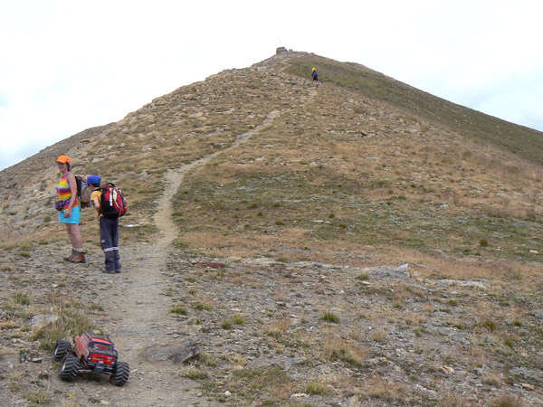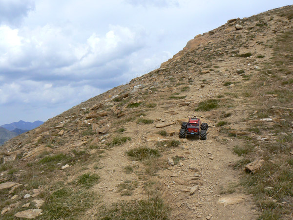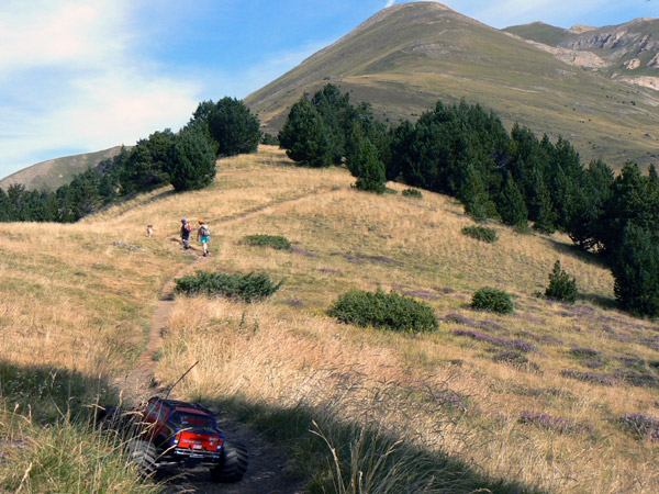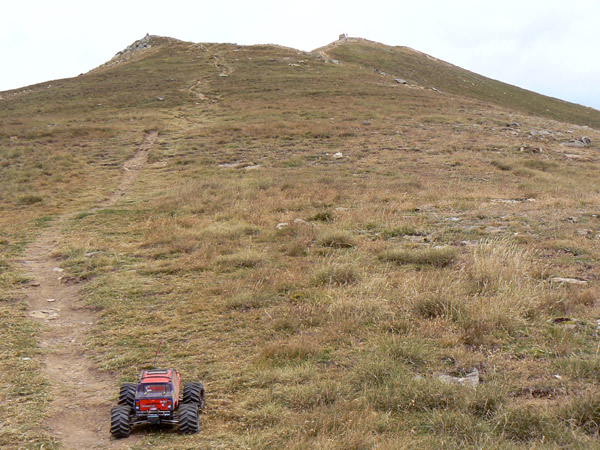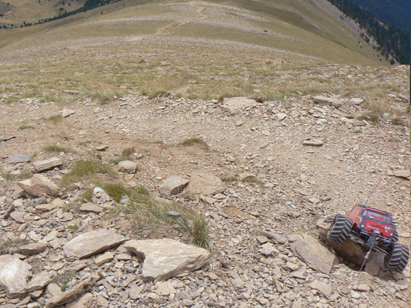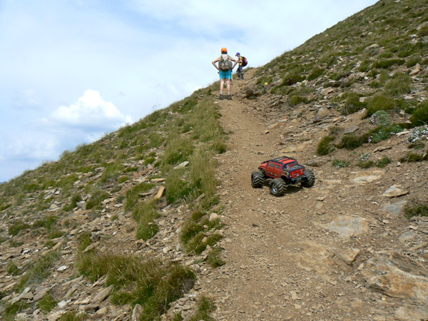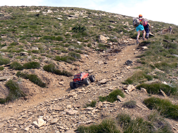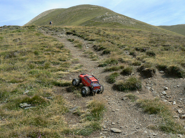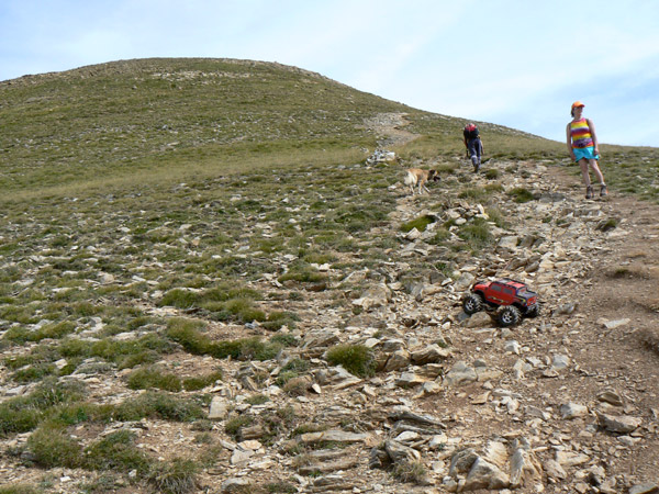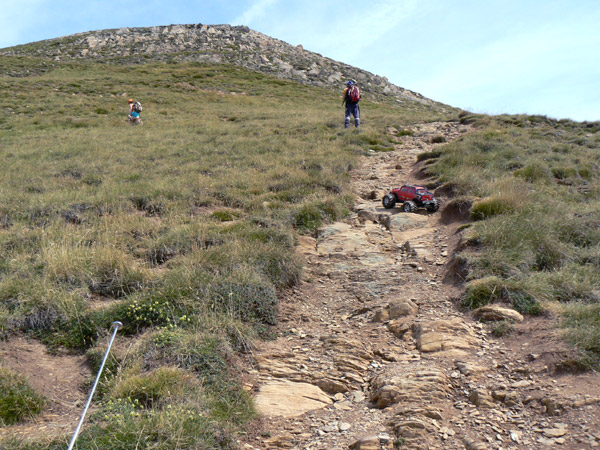 Las últimas rampas. Genís sigue diciendo que no quiere subir pero al final mi mujer le convence, es un valiente y solo hace falta recordárselo un poco para que se lo crea. En absoluto está el niño cansado, luego de regreso al camping correrá y saltara toda la tarde si hace falta. Yo también tengo que convencerme de que debo subir. El camino va sin rodeos ya directo a la cumbre. Es un tramo final a modo de "traca" , para subir todo en primera velocidad, esperando el Emaxx a que yo llegue a su posición para dar un nuevo tirón de veinte o treinta metros. Unas partes de esta subida las haré directamente por la escasa hierba que rodea el camino, otras por el sendero de tierra pro curando mantener las 4 ruedas dentro del estrecho margen.
