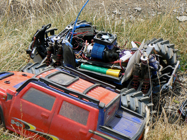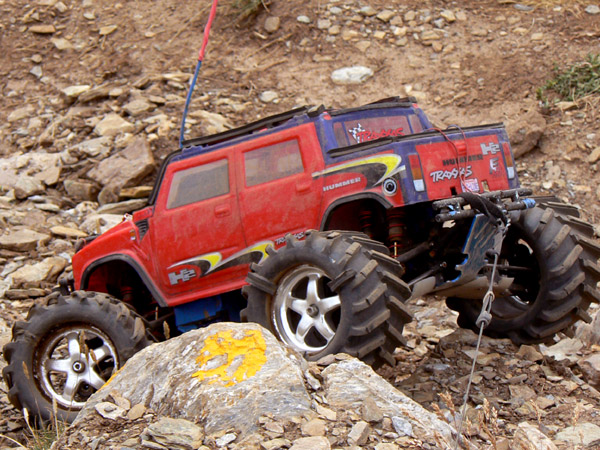 La subida interminable o la derrapada contínua En imagen más de lo mismo, ésta pendiente si es dura y el Emaxx está en un punto en que parece dudar entre derrapar o volcar. El caso es que incluso reemprendiendo muy lentamente la marcha es difícil predecir que va a hacer el coche, puede encabritarse y hacer amago de vuelco, puede irse hacia un lado o puede empezar a derrapar. A veces un poco de fuerza bruta no está mal y el Emaxx está sobrado de eso. Solo hace falta decisión, arrancar muy suavemente, empezar a derrapar acelerar fuerte sin que se levante y soltar de nuevo gatillo progresivamente hasta que parece encontrar una velocidad en la que se siente cómodo , por supuesto hay que evitar resaltes como la piedra en que está apoyado , eso le hace volcar casi de inmediato y de forma poco previsible.