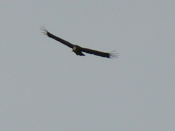 Es comestible un Emaxx? Mientras paramos a cambiar baterias vino este buitre a dar vueltas cada vez mas bajo y cerca nuestro . No son precisamente pequeños gorriones y a juzgar por la mirada e interes de este diría que tenía algo de hambre. Que era este bicho de piel roja que se movía como un pequeño perro y que trepaba por las piedras sin hacer ruido? . Luego vinieron algunos mas pero fueron deslizandose ladera y valle abajo. Esta foto esta hecha con zoom optico a 10X , un 350 equivalente y ampliada ligeramente . Estamos a unos 2400 m de altitud.