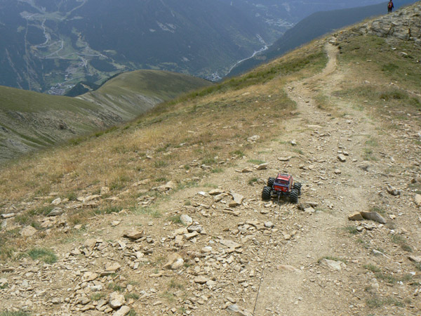 El descenso, 100% seguro y mucho mas rapido Viendo que la meteorología no acompañaba decidí acelerar un poco el regreso, exactamente mil setecientos metros más abajo la poblacion de Andorra_la_Vella en esa carretera que se ve al fondo. Nosotros solo teníamos que bajar 800 . No tenía ya muchas ganas de andar trialeando la verdad, y opté por hacer toda la bajada con la cuerda de seguridad, por lo menos hasta que la anchura fuera suficiente para desconectar la emisora si le daba un pronto de esos que de repente ponían el coche a 100% de potencia y girando a tope. El seguro no es más que una cuerda de recogida automática, cinco metros de longitud, de las que se utilizan para llevar los perros a pasear , esos de más de 20 Kg... Puede verse en esta foto, está atada a las dos piezas que unen ambas partes de los tabiques traseros, es una zona bastante resistente y que ya ha aguantado tirones serios y caídas de varios metros. El mando de recogida de cuerda lo llevo atado a la cintura, bien al cinturón o al de la cinta que sujeta la mochila al pecho. Hay que prestar algo de atencion al equilibrio 5 Kg despues de caer un par de metros llevan mucha inercia y el tirón es fuerte, aunque que afortunadamente previsible. La cuerda de seguridad te deja bajar más rápido y con seguridad, fijando en donde pones tus pies.- algo que me interesa especialmente después del accidente de febrero- . De alguna forma bajas más despreocupado del coche teniendo la certeza de poder evitar un vuelco o una caída lateral.